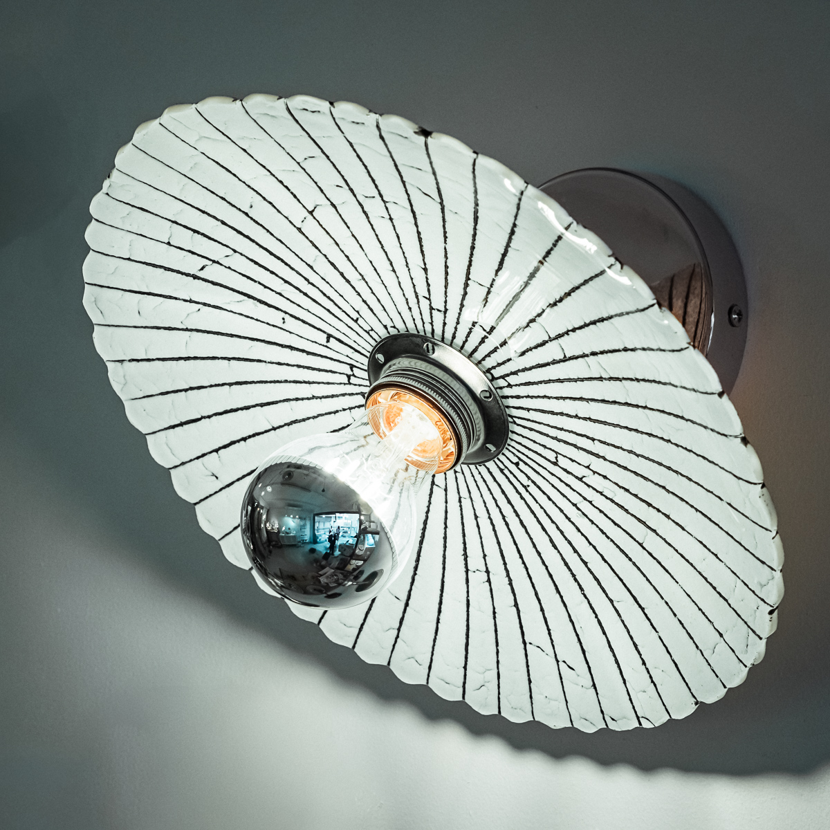 Applique murale orientable de couleur grise foncé brillante munie d'un abat-jour en verre fusionné et thermoformé beige et noire (pièce unique).