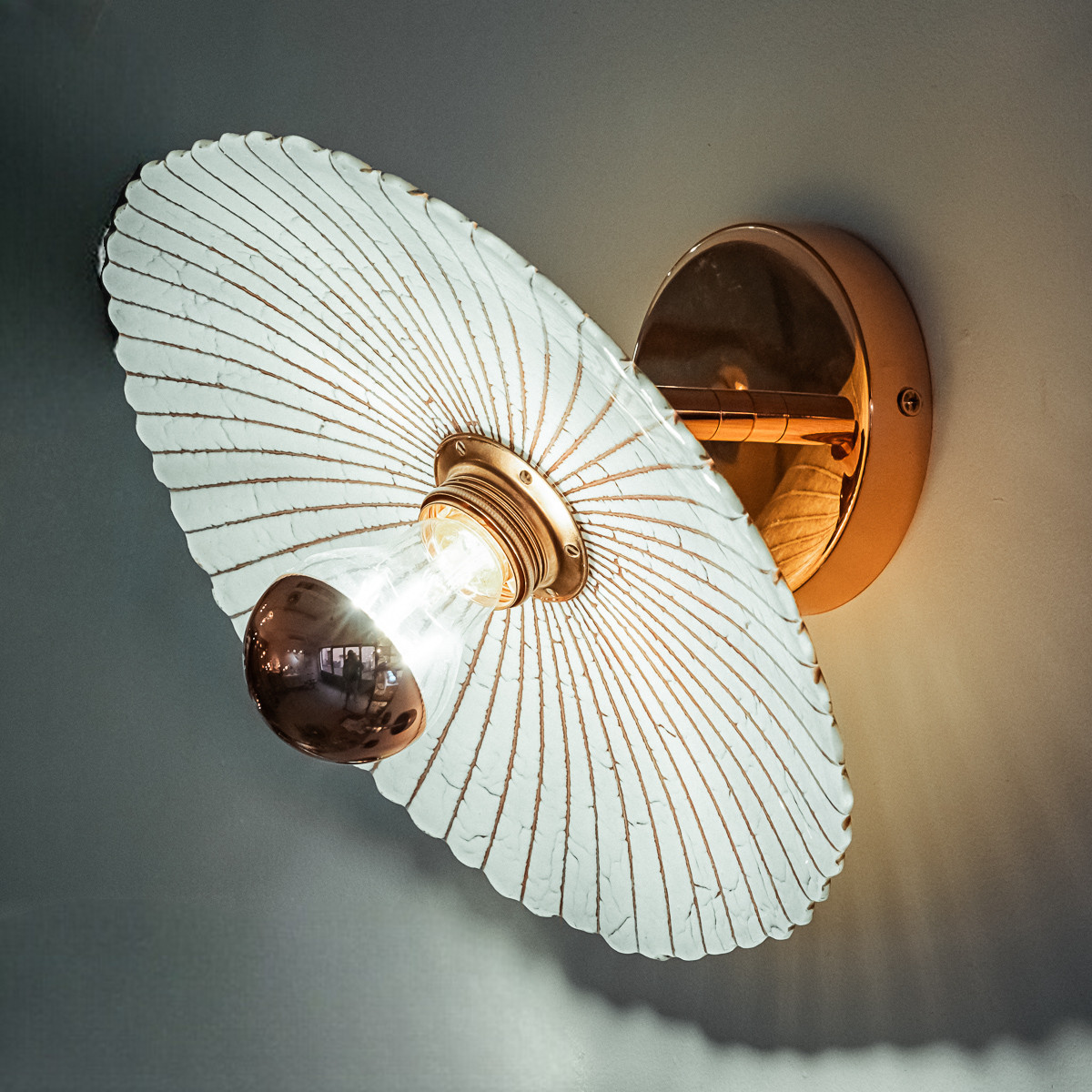 Applique murale orientable de couleur cuivrée brillant munie d'un abat-jour en verre fusionné et thermoformé beige et corail (pièce unique).